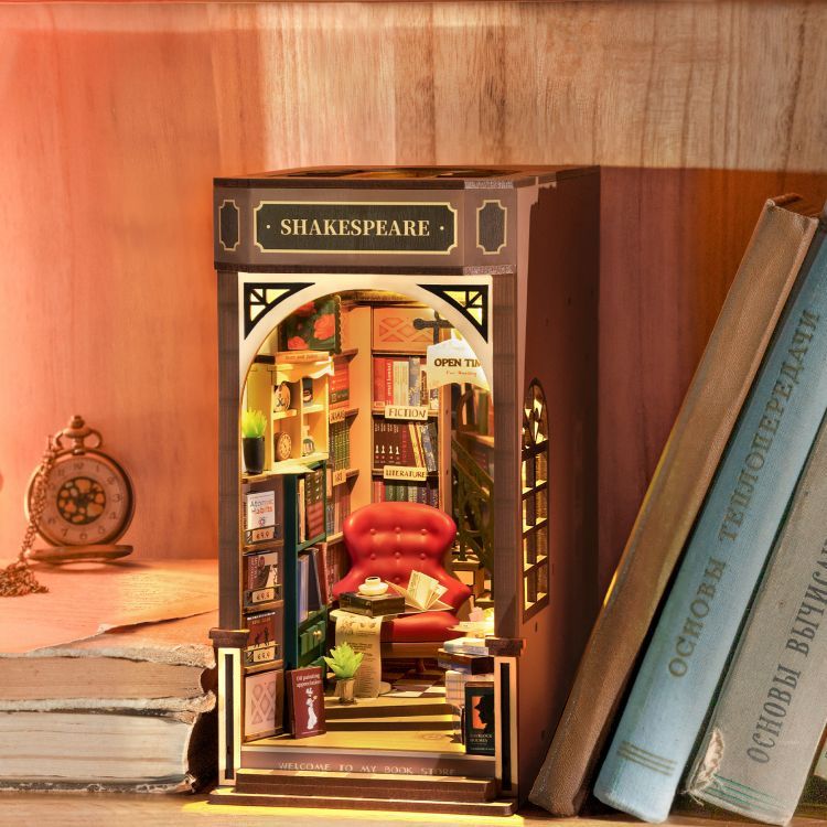Новая вещь для меня так называемый румбокс ("комната в коробке").Он описывается как конструктор, который в сборе представляет собой модель помещения или домика с узким торцом шириной сопоставимой с книжными корешками. Или даже фрагмент узкой улочки. Его можно поставить на книжной полке как разделитель или упор для книг, или как украшение. В румбоксе можно сделать автономную подсветку, так сказать включить в комнате свет. По мне так не на всякую книжную полку эта вещица встанет. Даже для узкого румбокса может просто не быть места.