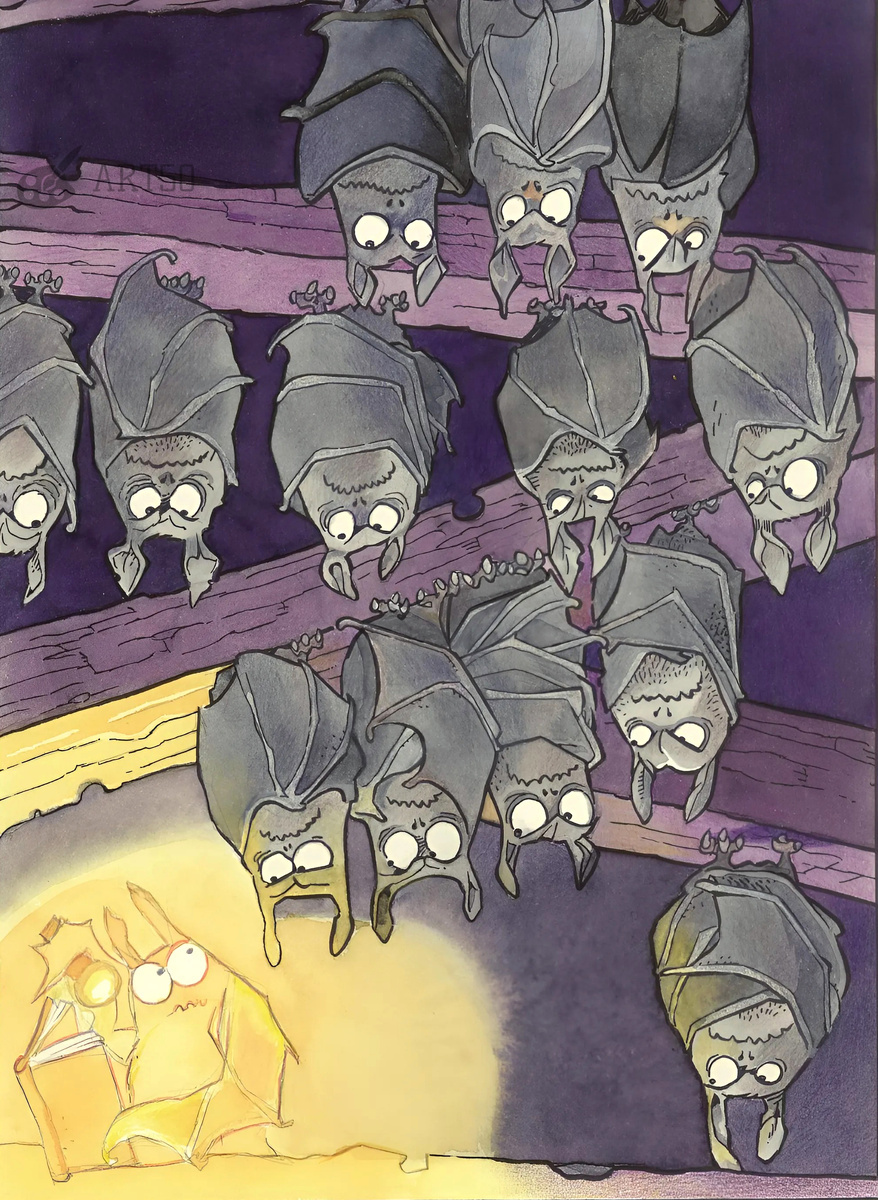Итальянский художник Мауро Таларико заострил распространённый сюжет про истового книголюба, готового читать всегда, хоть ночью с фонариком под одеялом, сделав героем карикатуры летучую мышь. Очень симпатичный сюжет.